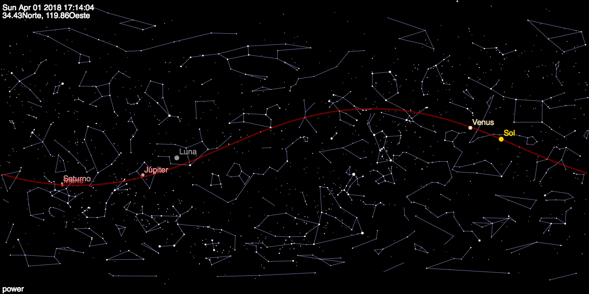 - Abril 03, 16:13. Júpiter a 3.7 grados al sur de la Luna, en la constelación de la Libra. Configuración visible después de la media noche hacia la parte este de la esfera celeste.